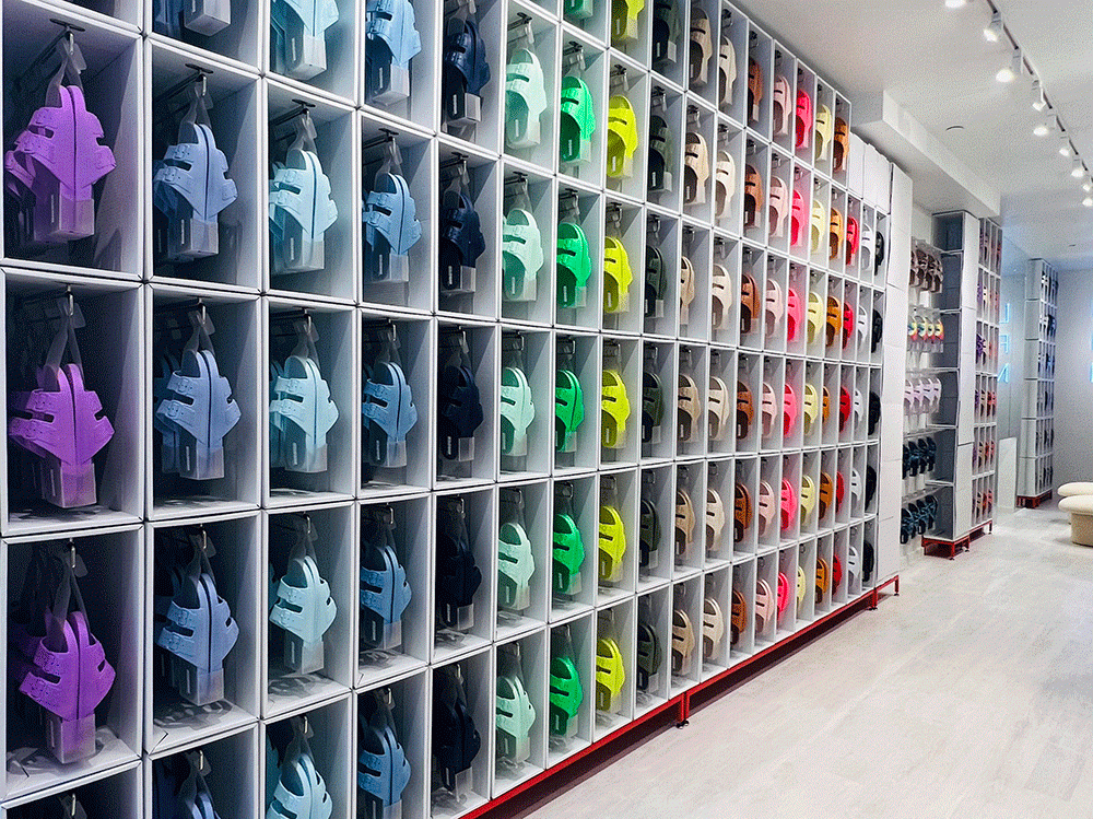 Open through September, the 550-sq.-ft. Freedom Moses pop-up has a self-service shopping model, with more than 1,300 pairs of slides lining the walls in a kaleidoscope of bright colors (the brand currently boasts over 140 different colorways). Prices start at $45.