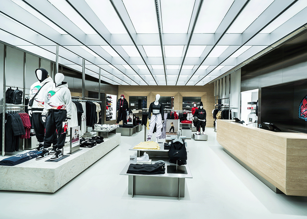 The centerpiece of the stylish-looking store is the “Flight Lounge,” where customers can explore the roots of the brand. Photographs of Michael Jordan’s career and related imagery accent the circular space, along with displays of Jordan products.